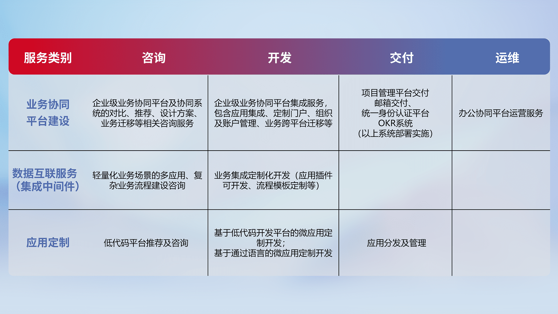 针对钉钉、、、企微、、、IDaas等平台级产品提供产品的规划、、方案、、交付、、、、定制化开发等服务,,实现如统一协同办公、、、智能客户服务、、、混合会议管理、、、智能数据查询、、等业务场景,,,,实现数字化转型。。。
