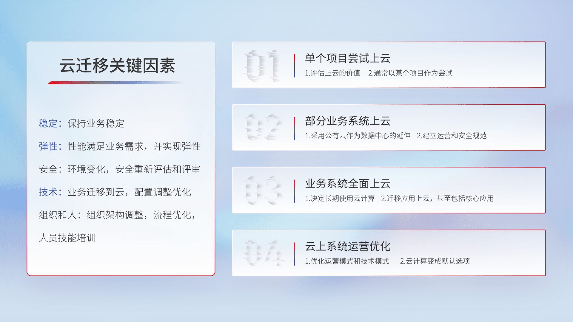 结合实际业务,,,,从规划设计、、、云平台选型、、、云原生改造、、数据迁移、、集成交付,,迁移全过程为客户识别最佳上云路径,,做好风险识别管理,,,,设计网络架构、、、身份权限、、、安全审计合规、、操作审计、、日志审计、、监控告警策略、、多站点容灾设计等,,,,对云上基础设施进行整体规划,,,提升IT治理水平,,以满足弹性、、、高可用、、高性能的需求。。。