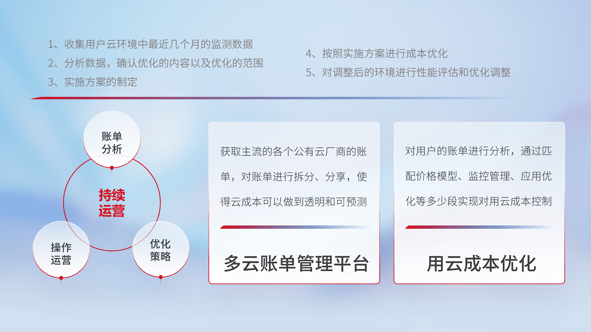 通过多云纳管,,以统一的资源数据模型把客户的云资源进行抽象和封装,,,,进而实现对多云资源的统一操作,,,保障云资源管理的可靠性、、稳定性与可用性。。量身定制化运维内容,,,,配置、、开发运维、、补丁管理、、、、备份、、、监控、、认证和访问管理、、、、审计和日常巡检等,,保障在用云过程中的可靠度,,稳定度以及高可用率。。。